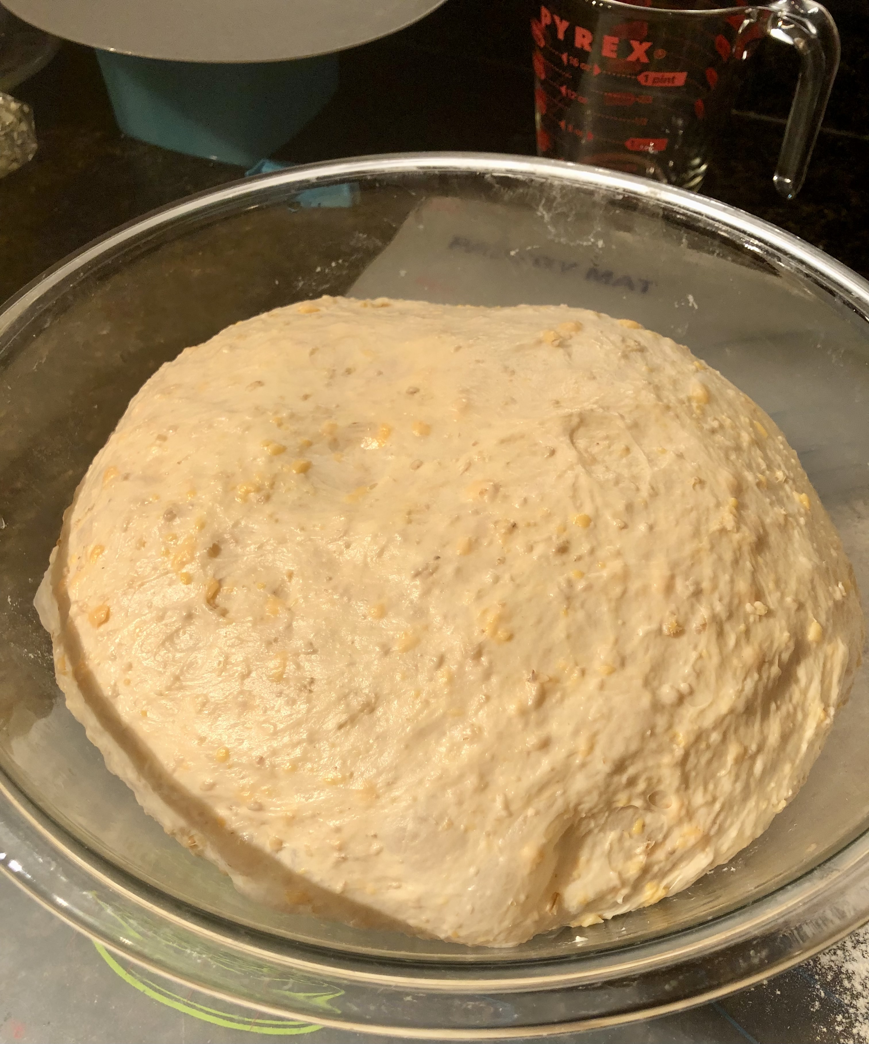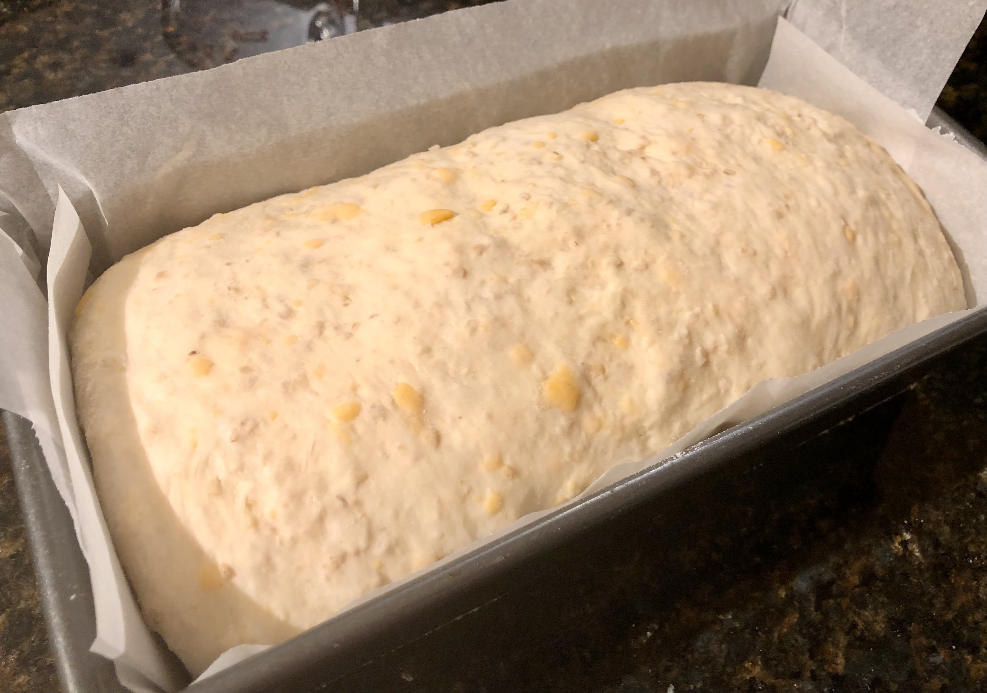밀가루, 오트밀 소진을 위해 오트밀도 넣고 소금으로 간을 하고 스페츌라로 슬슬 섞는다. 팔 힘으로 마구 휘저을 필요는 없다. 슬슬 가루를 잘 섞어 준다는 생각으로 천천히… 둥글 둥글 동그랗게 뭉쳐진 것 같으면 끝. 이제 기다리면 된다. 30분 후에 한 번씩 접어주며 3회 정도 반복한다. 두 번째 접을 때쯤 체다 치즈를 넣고 접어 준다. 그렇게 접기 후에 이제 남은일은 이스트에게 맡기고 휴식. 날이 좋아서 그런지 한 시간 정도 되니 딱 적당히 부풀어 올랐다. 이제 공기 빼고 모양 잡아 틀에 넣어 기다려 본다.