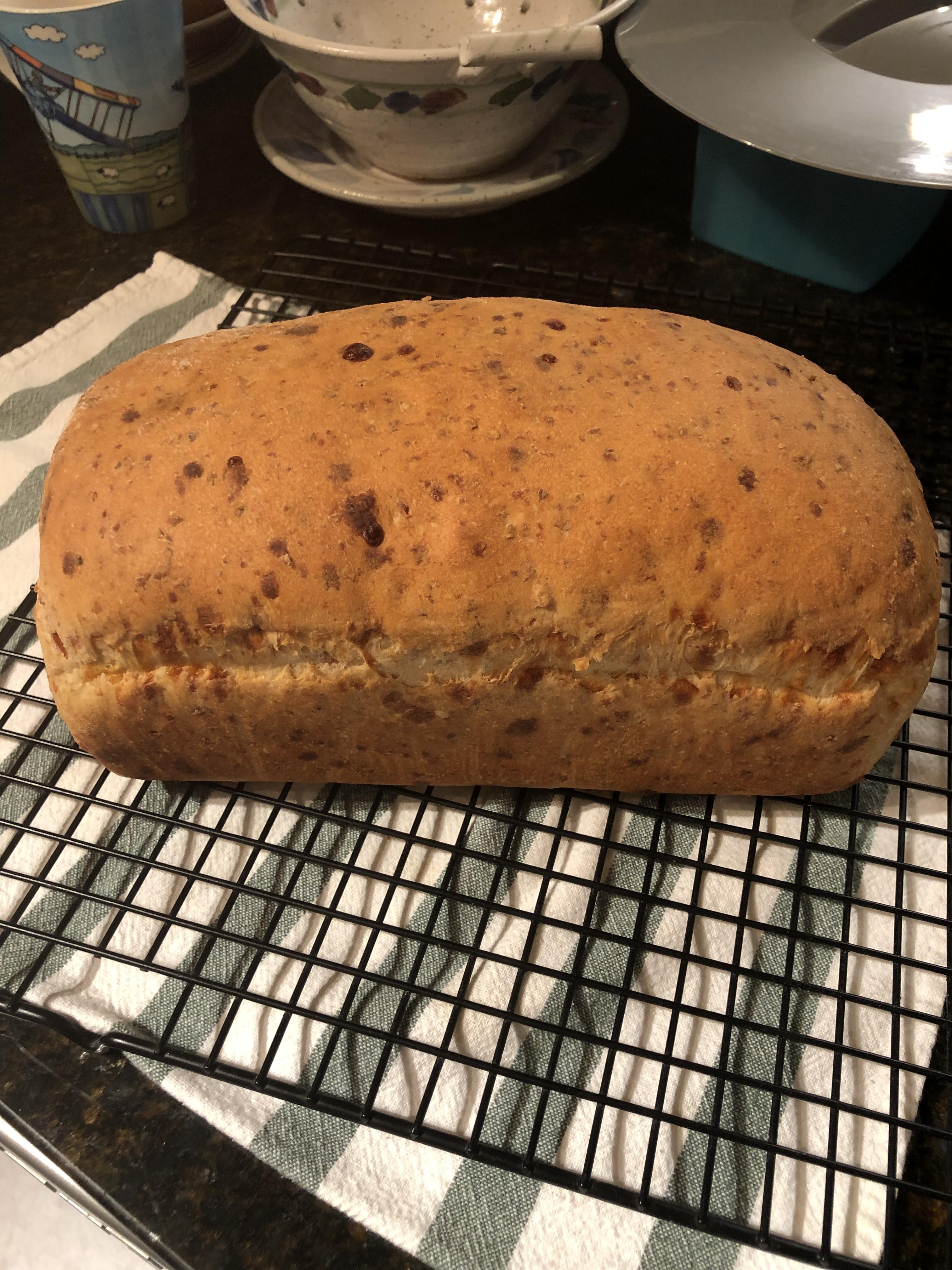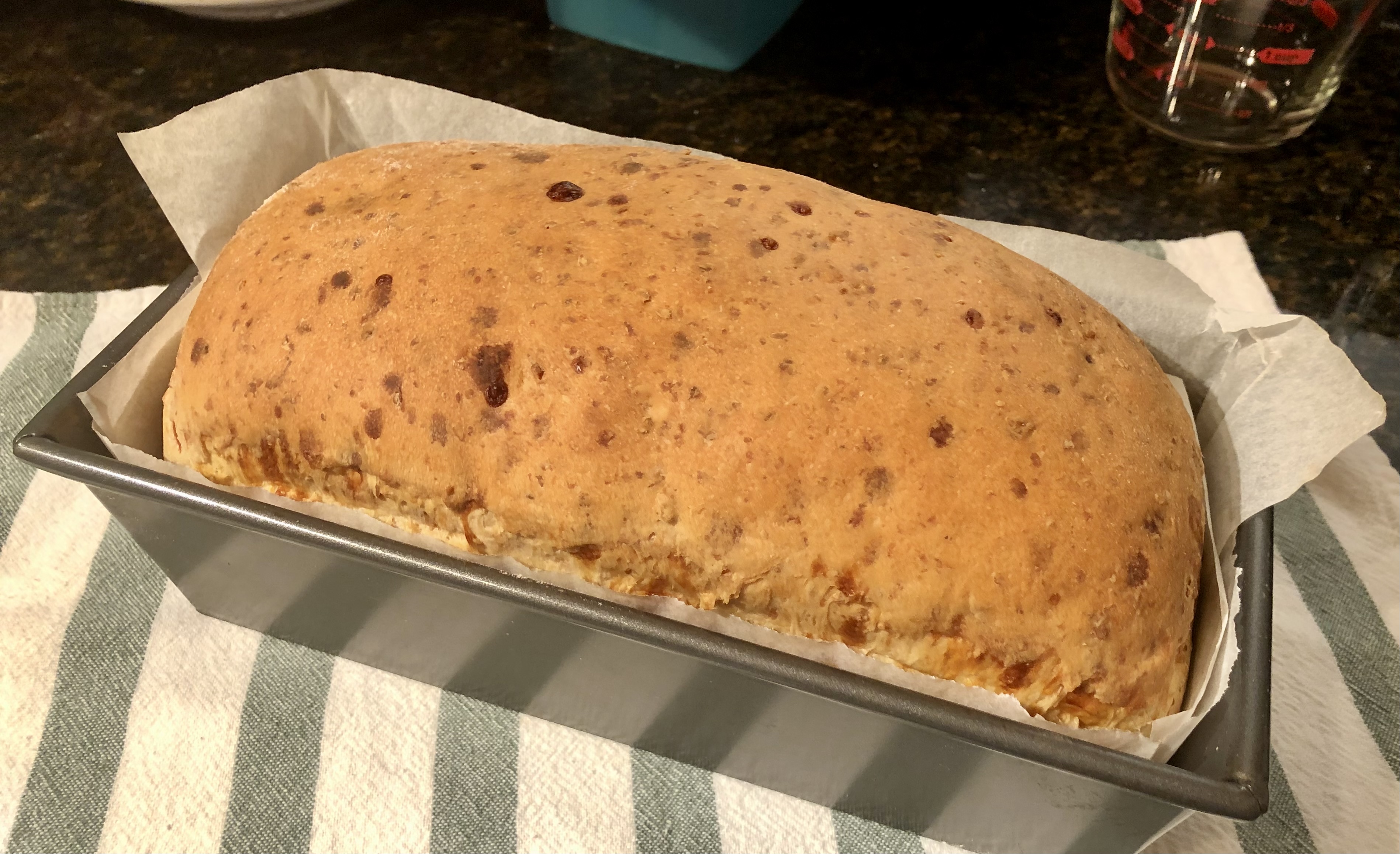 반죽이 알아서 잘 부풀어 오르고 있는 것이 확인 되면, 오븐을 예열 시작. 처음에는 높은 온도로 30분 정도 굽고, 온도를 낮춰 색을 봐 가며 10분 정도 더 굽는다. 이제 다 되었다. 오븐을 끄고 꺼내어 식힌다. 구수한 빵 냄새 유혹에 넘어가서는 안된다. 충분히 식히고 썰어야 그 모양이 유지된다. 이제 내일 아침 허둥지둥 도시락을 뭘 싸야 될지 고민하지 않아도 될 것 같다. 내일은 샌드위치 당첨이다.
